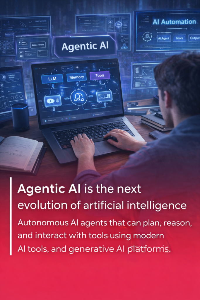 Agentic AI is the next evolution of artificial intelligence where AI systems can plan, reason, take actions, and interact with tools autonomously. Unlike traditional AI models, Agentic AI systems can complete complex multi-step tasks, integrate with APIs, and continuously improve through feedback loops.